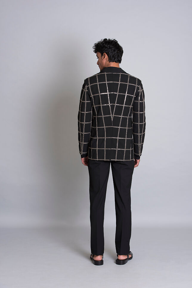 Description:- Black geometric pattern hand embroidered coat with pants.