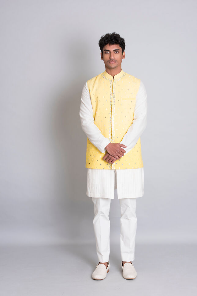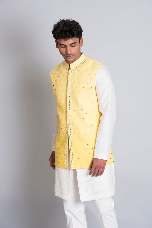 Description : Yellow Ombre hand embroidered mirror work bandi.