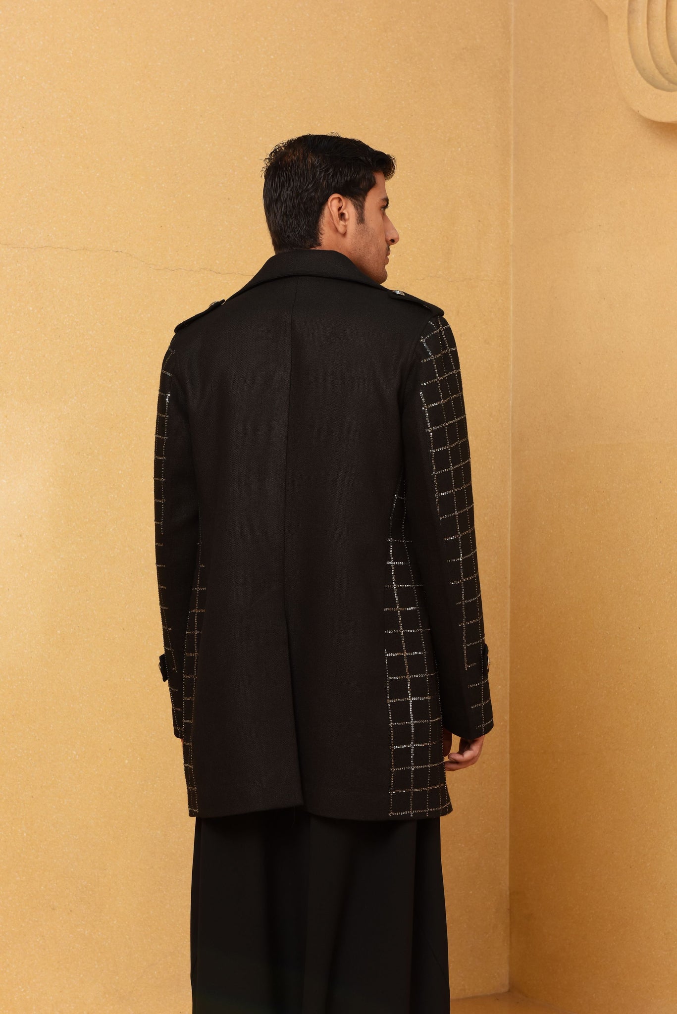 Description : Black matka silk geometric lines silver embroidered jacket