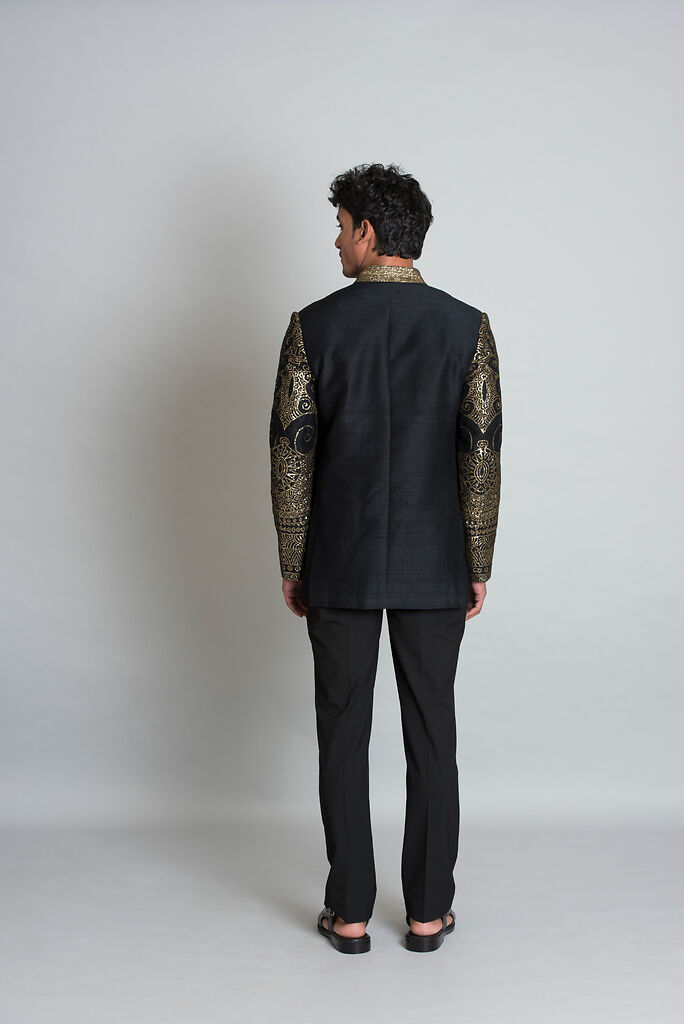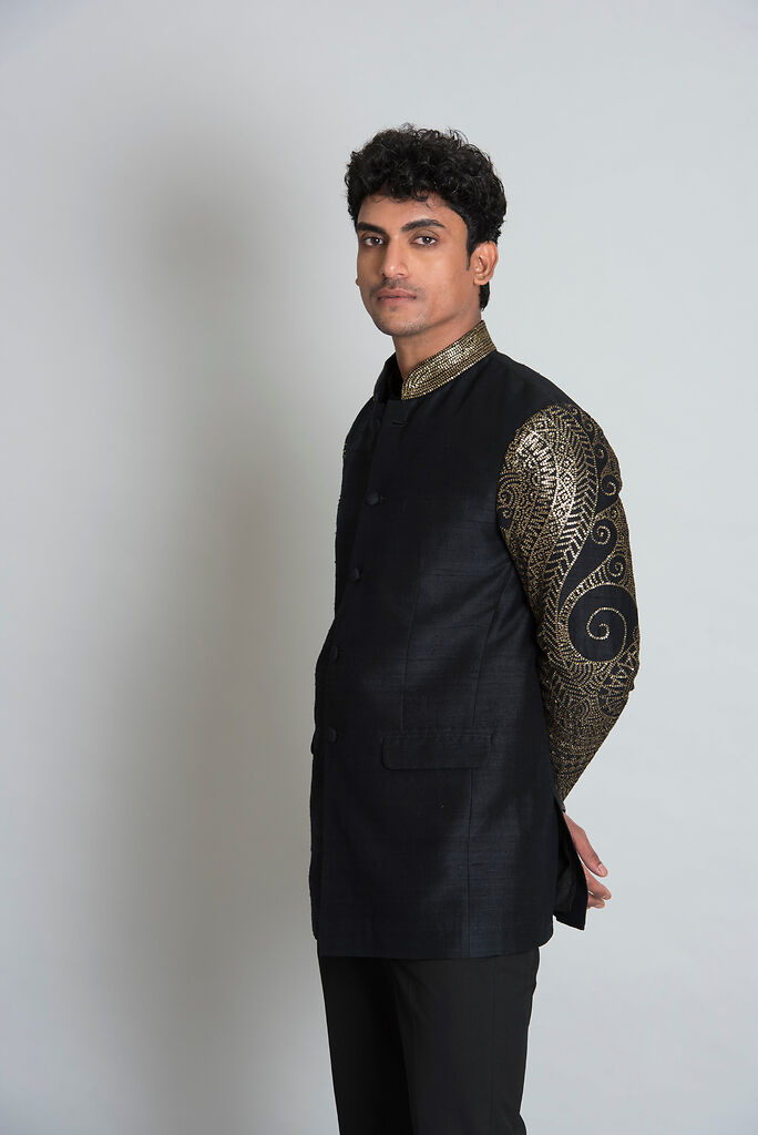 Description : Black embroidered sleeves & collar bandhgala.