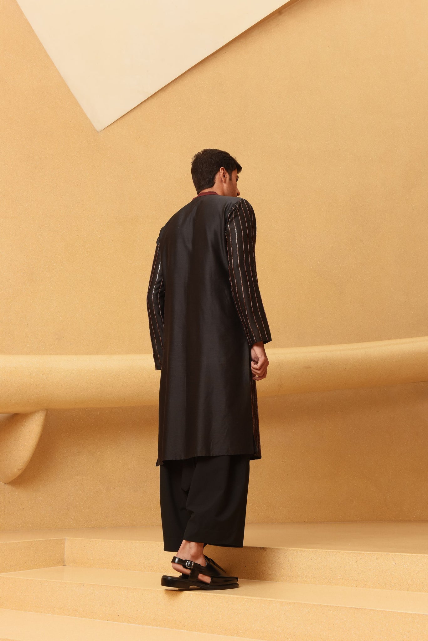 Description : Black geometric lines silver embroidered bandhgala with pants.