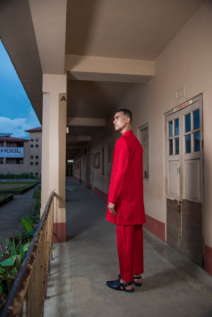 Description : Red front opening kurta sherwani with pleats and pin tucks detailing & pleated straight pant