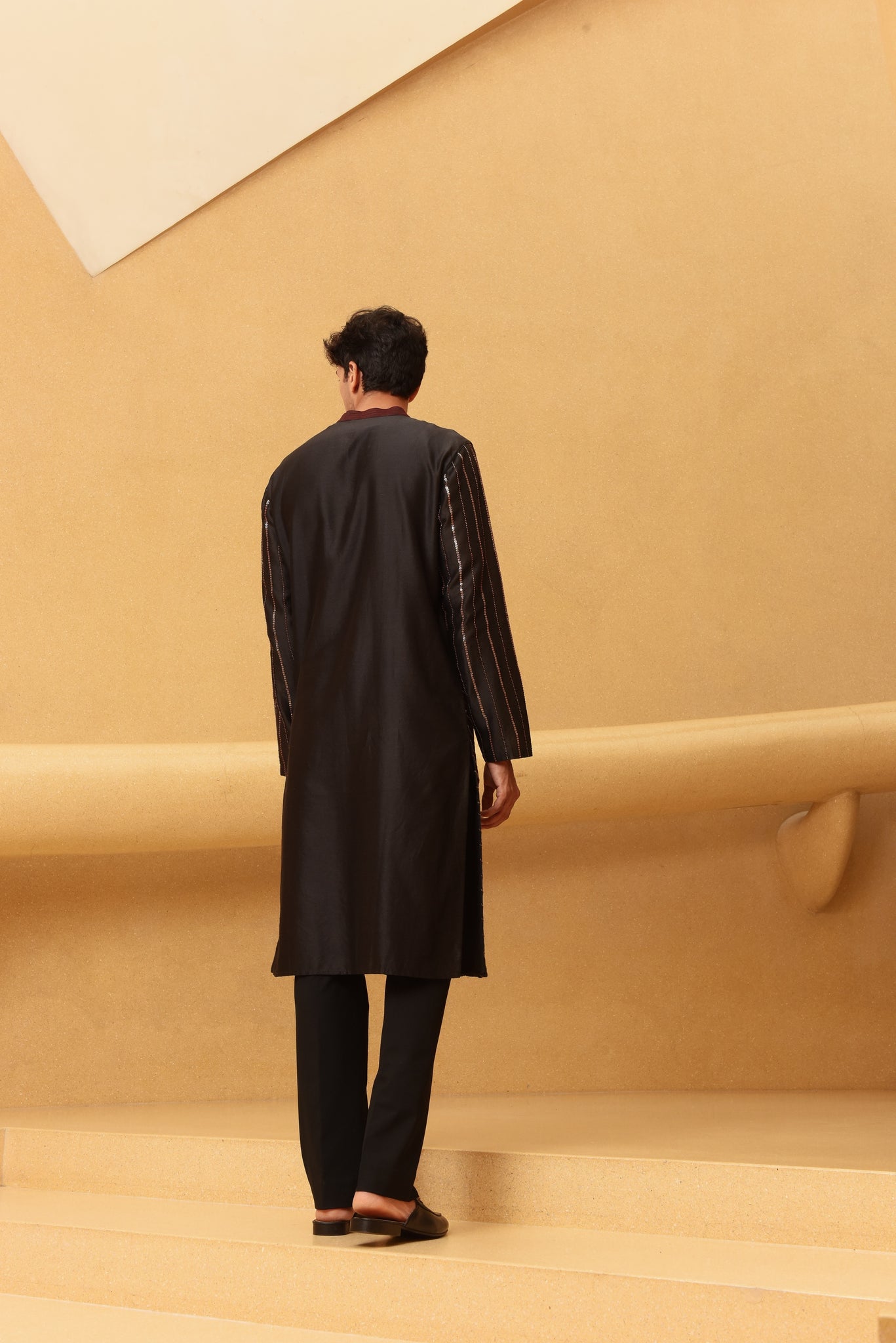 Description : Black diagonal line hand embroidered kurta.